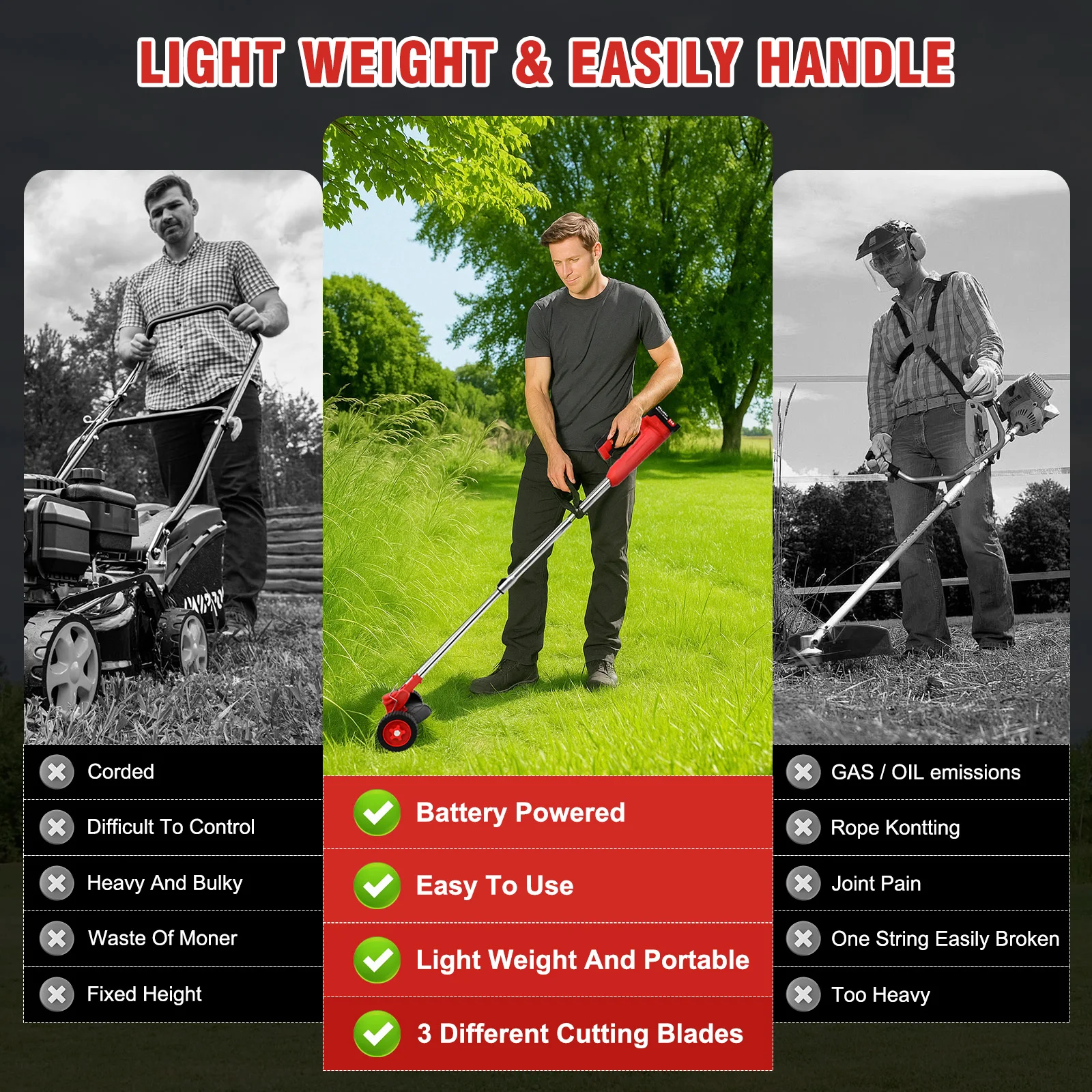 21V Cordless Weed Wacker Electric Grass Trimmer 3-in-1 Brush with Wheels 24V Lithium-ion Edger and Trimmer for Lawn and Garden