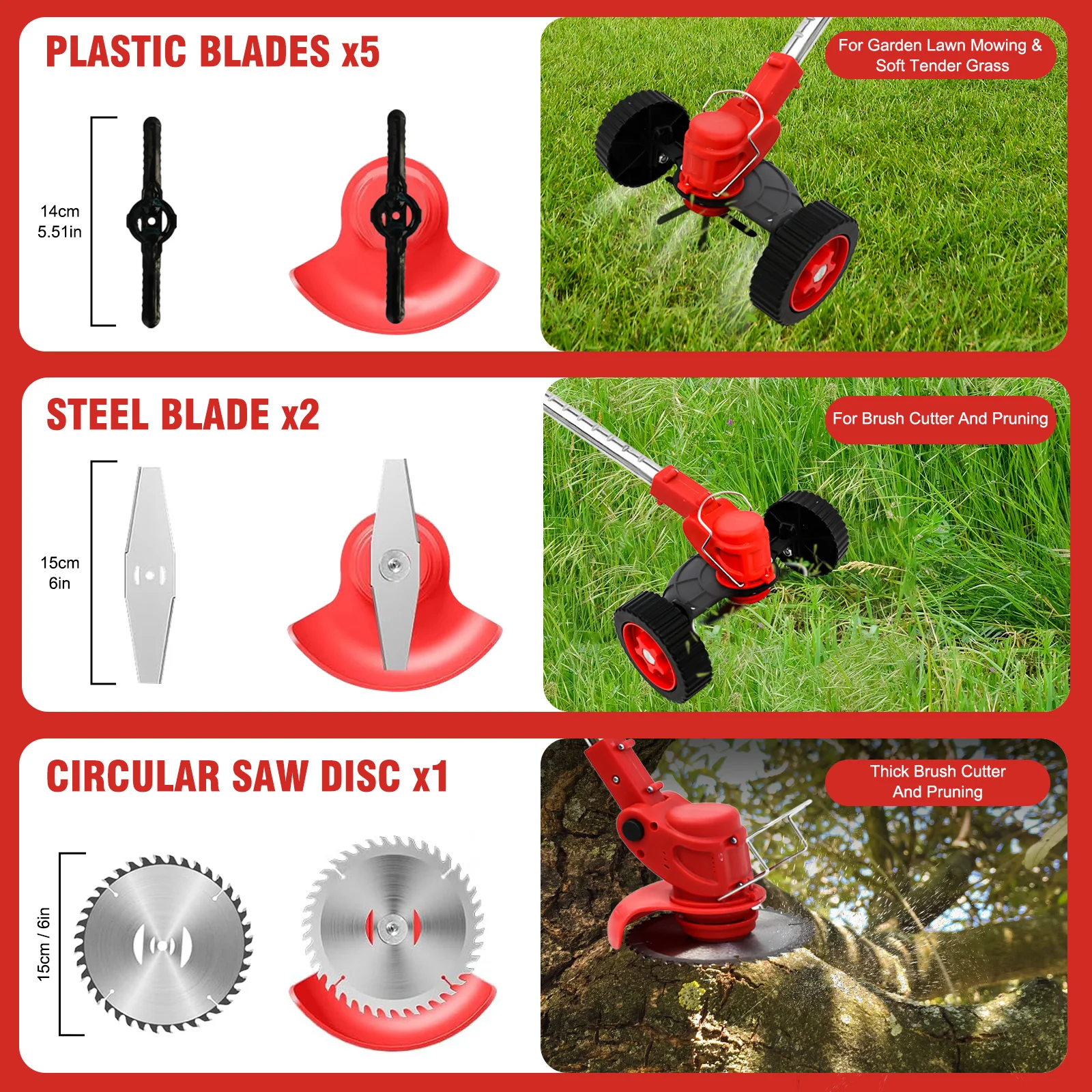 【Three-in-One Blades for Various Challenges】The cordless grass trimmer comes with three types of blades. Plastic blades are designed for soft lawns, easily removing weeds and refreshing your lawn. Stainless steel blades are tough and durable, suitable for trimming stubborn weeds and small shrubs, keeping your garden neat. The alloy saw blade is for thick bushes, branches, and seedlings, powerful and unyielding to any challenge. Be sure to choose the correct blade to protect the trimmer and extend its lifespan.